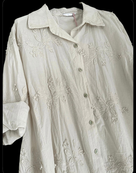 Skjortklänning i vackert brodyrtyg , knappar fram , något längre i bak än i fram . vackraste skjortklänningen vi har haft 💗 rymlig i storleken . sista bilden ser du hur den sitter på.