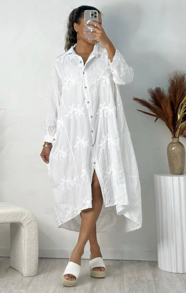 Skjortklänning i vackert brodyrtyg , knappar fram , något längre i bak än i fram .Sista bilden ser du hur den sitter på .