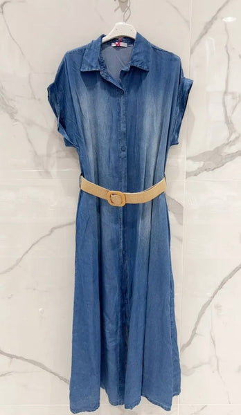 Mjuk och skön Jeansklänning med knappar hela vägen ner och skärp , kan med fördel användas som kimono , dolda fickor i sidorna