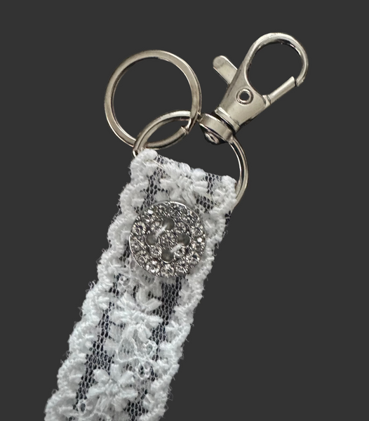 Nyckelring / väsksmycke med spetsband och strass knapp