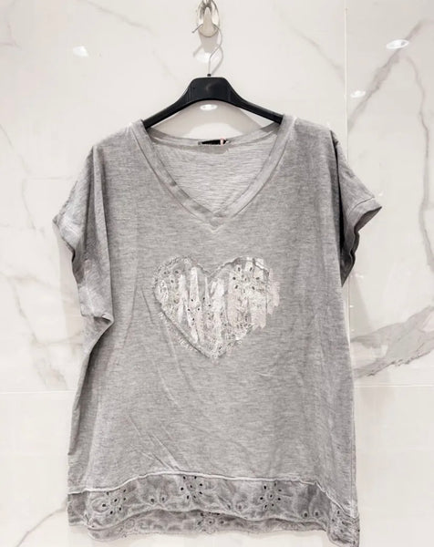 Stentvättad T-shirt med dekorativ hjärta i fram , fin kant nertill i brodyrtyg