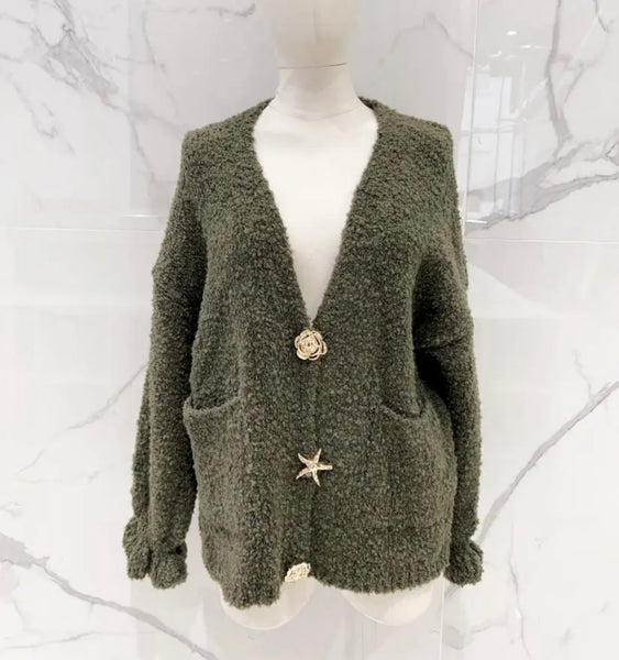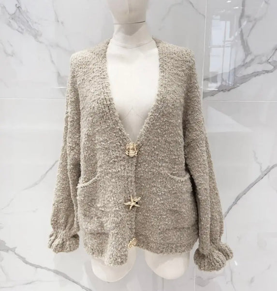Riktigt mjuk och skön kofta med vackra Broscher som man lÀtt kan ta bort och du har vanliga knappar under , resÄr i Àrmslut .