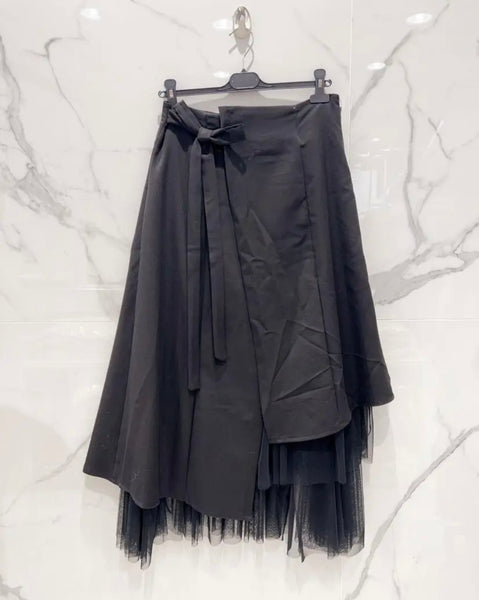 Riktigt snygg kjol med tyll samt omlott tyg med knyt över , kjolen stängs med dragkedja i ena sidan , tygen är stumt så inget stretch i midjan .