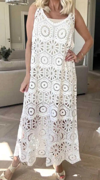 Lång virkad klänning , ingen underklänning finns . Fint med linne och shorts under eller en fin underklänning , så mjuk och skön .