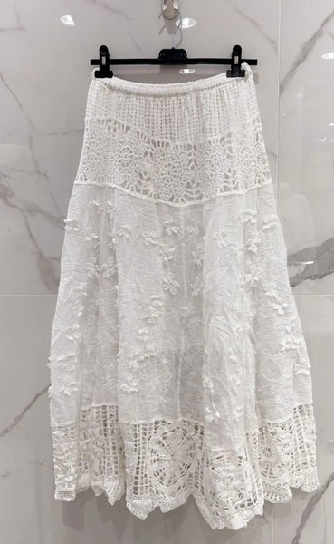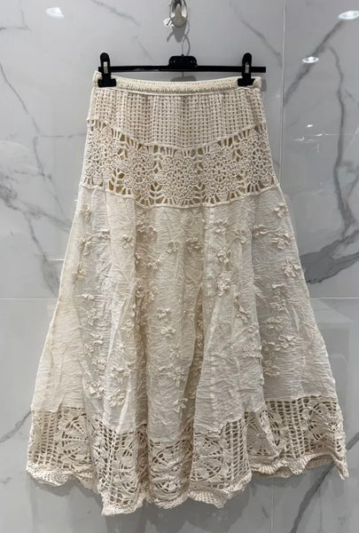 Mycket vacker kjol med resår i midjan , fastsydd underkjol som når till knät.
